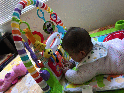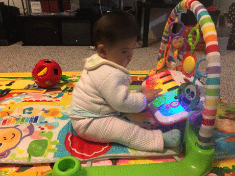这个Fisher-Price的健身毯是五星推荐,必买。珞珞前三个月每天玩儿的时间大部分都是围着这个玩具,可以躺着抓上面挂着的玩偶(每个玩偶不同材质,可以刺激她的触觉);脚踢琴键可以锻炼她的肢体动作,踢出的音乐可以刺激她的听力(三种音乐模式可以选择);自带的镜子可以看到自己;宝宝趴在上面可以做tummy time,训练她的脖子和上肢力量。再长大一点可以坐着玩儿,绝对是珞珞六个月前玩儿的最多的玩具了。